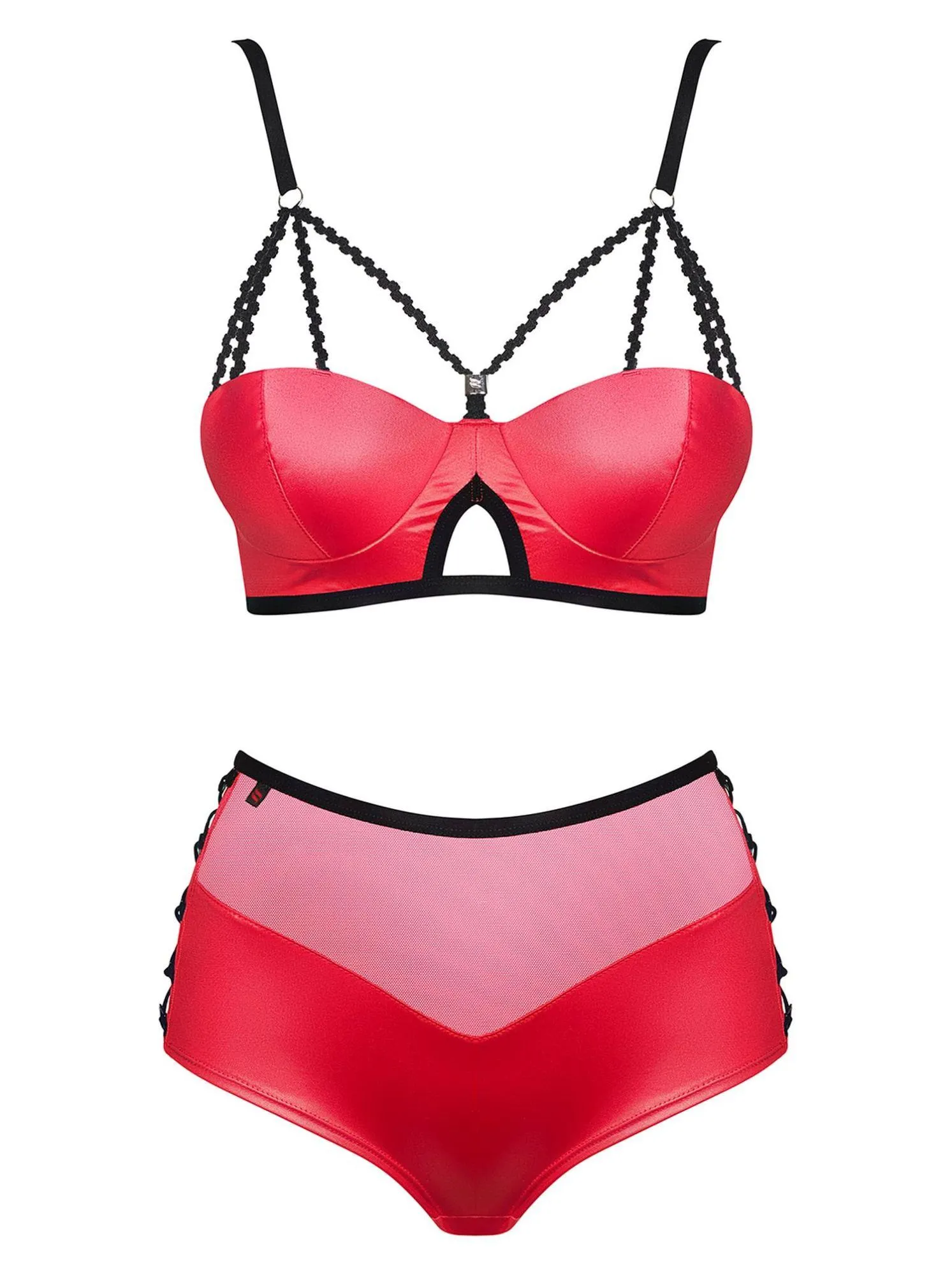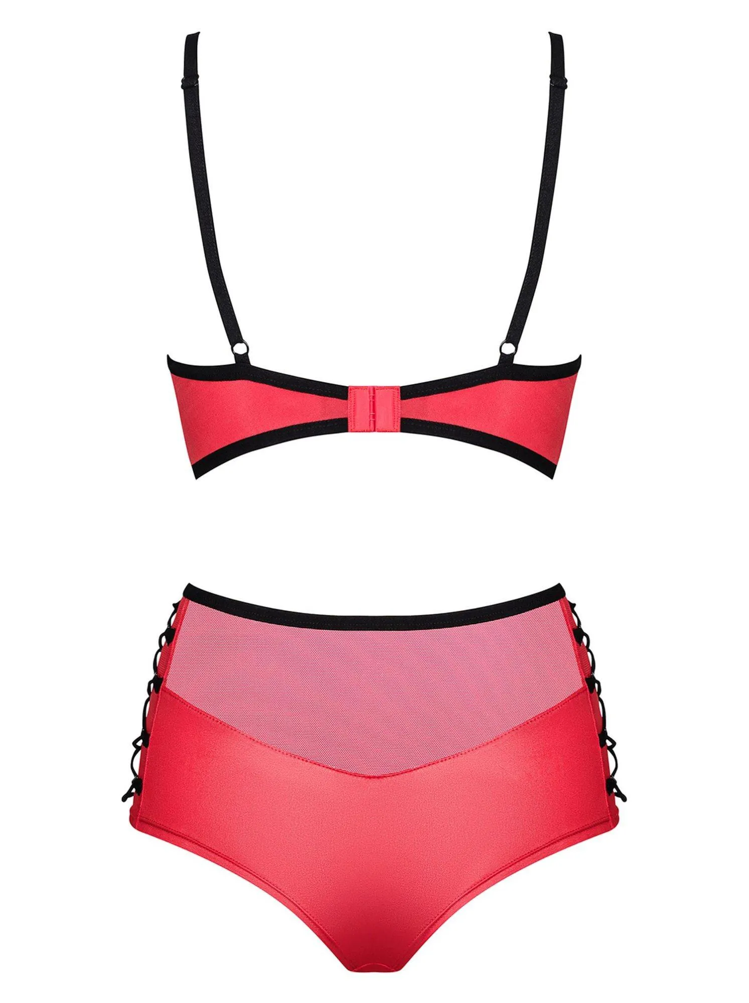 W zestawie znajdują się również wysokie majtki z kontrastowym sznurowaniem, które idealnie współgrają z biustonoszem. Wycięcie pod biustem przyciąga uwagę i dodaje odrobiny pikanterii całości. Komplet wykonany jest z wysokiej jakości materiałów (90% poliuretan, 10% elastan), co zapewnia nie tylko trwałość, ale także wygodę noszenia na co dzień oraz podczas wyjątkowych okazji.