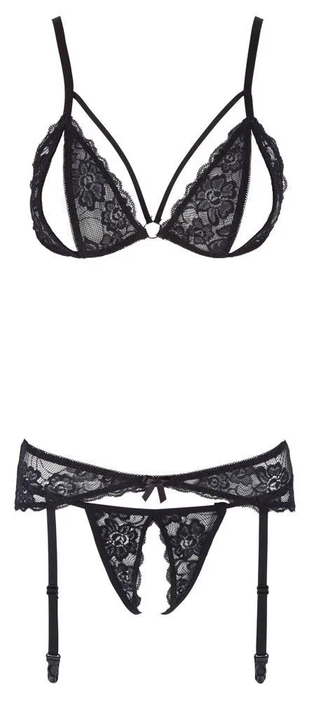 Zestaw koronkowy z zawieszkami S to wyjątkowy wybór dla kobiet poszukujących elegancji oraz zmysłowości. W jego skład wchodzi biustonosz i pas do szelki, które doskonale podkreślają kobiece kształty. Regulowane ramiączka umożliwiają idealne dopasowanie do sylwetki, a atrakcyjne detale na ramiączkach oraz ozdobny pierścień dodają całości niezwykłego charakteru. Miseczki wyposażone w rozcięcia sprawiają, że zestaw nie tylko przyciąga uwagę, ale również zapewnia komfort noszenia.
