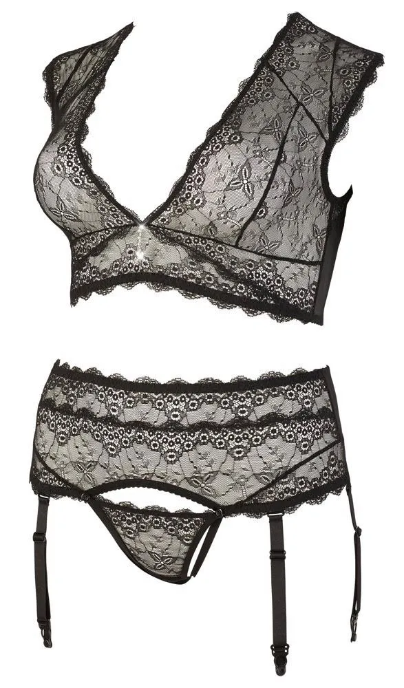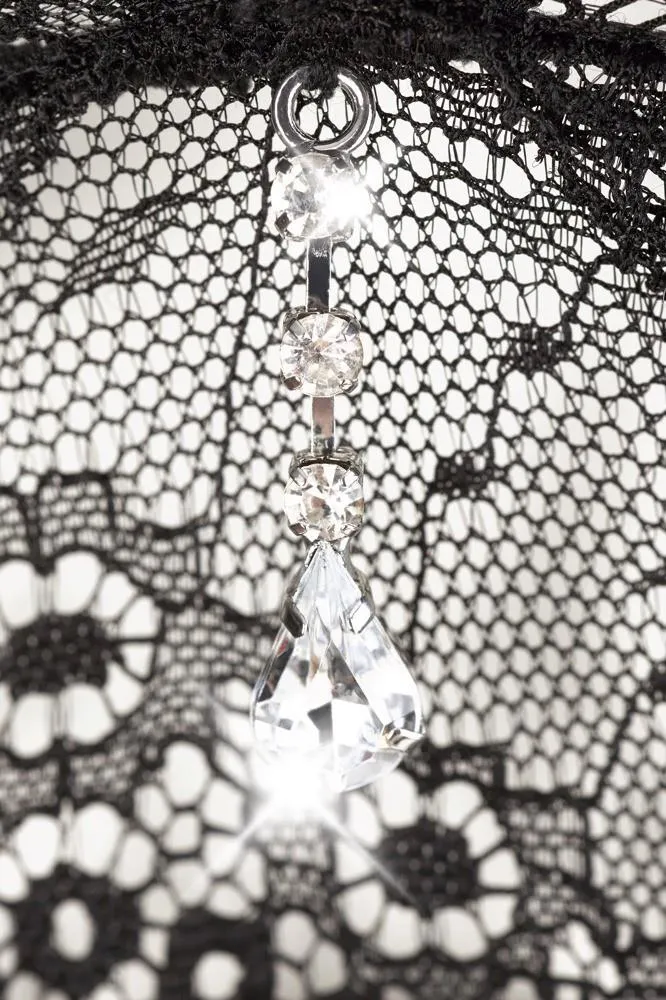 Braletka wyróżnia się głębokim dekoltem, ozdobionym subtelnym elementem z dżetów, oraz praktycznym zapięciem na haftki z tyłu. Stringi dopełniają całości, oferując 6 regulowanych i odpinanych szelek oraz innowacyjną konstrukcję, która pozwala na ułożenie części stringowej w sposób zmysłowy i wygodny. Dwie gumki przechodzące z boku krocza zapewniają nie tylko efektowny wygląd, ale również komfort podczas noszenia.