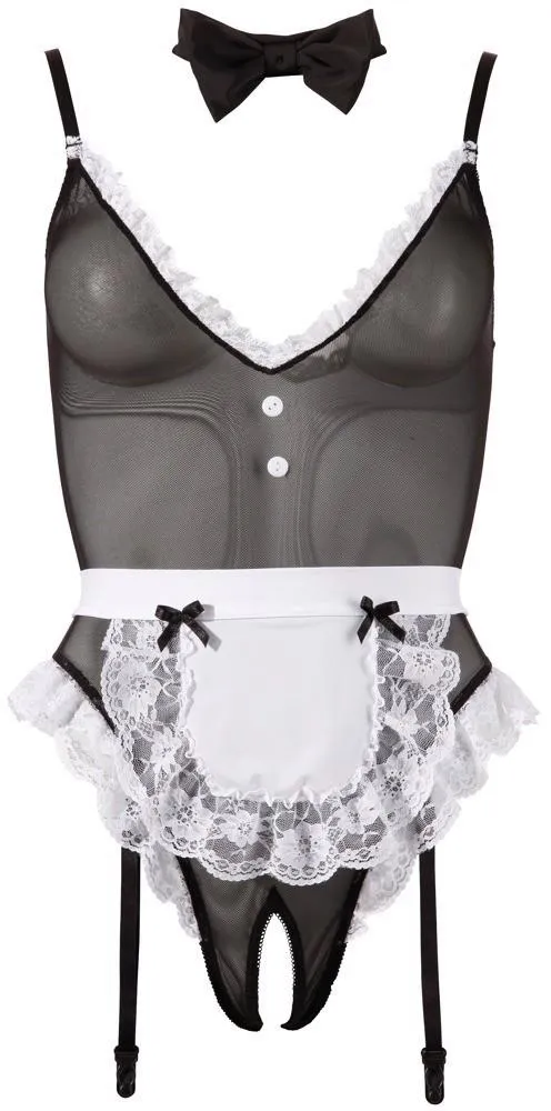 Projekt tego unikatowego bodysuitu jest przemyślany w każdym detalu. Otwarte w kroku, sprawia, że jest nie tylko seksowne, ale również funkcjonalne. W zestawie znajduje się także elegancki kołnierzyk z muszką oraz zapięcie na rzep, co dodaje całości klasy i wyrafinowania. Oprócz tego, do produktu dołączony jest praktyczny fartuszek, który można zawiązać, co czyni tę stylizację jeszcze bardziej kompletną.