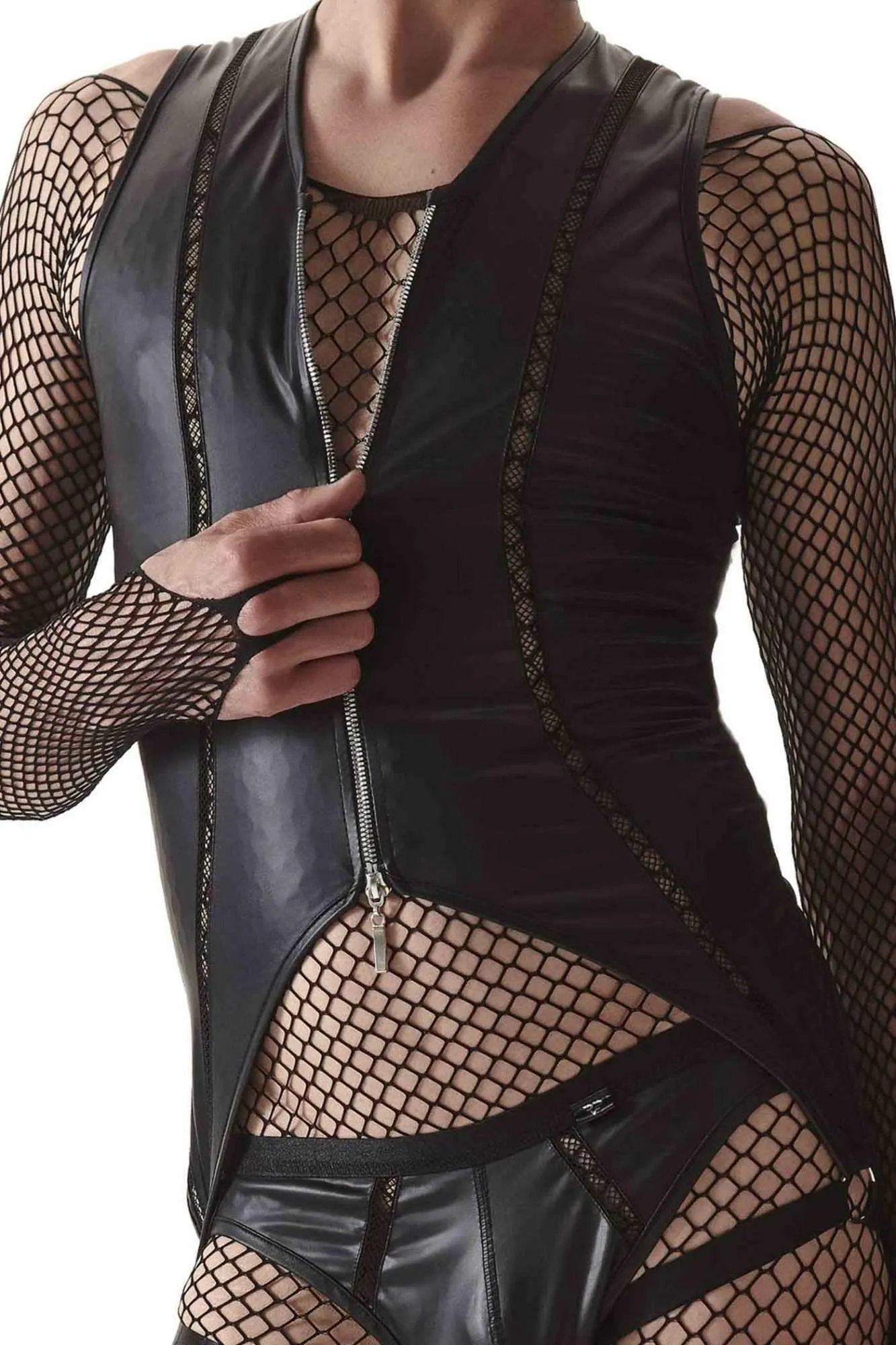 Regnes - CRDSET002 to zmysłowe body oraz majtki w kolorze czarnym, które doskonale podkreślają elegancję i seksapil. Wykonane z wetlooka, body prezentuje się efektownie, a jego unikalne detale sprawiają, że jest idealnym wyborem na wyjątkowe okazje. Przód zdobią pionowe elementy dekoracyjne z czarnej siateczki, które nadają mu niepowtarzalnego charakteru. Dodatkowo, dwustronny zamek błyskawiczny z ozdobnymi suwakami umożliwia łatwe zakładanie oraz zdejmowanie, a jednocześnie przyciąga wzrok.