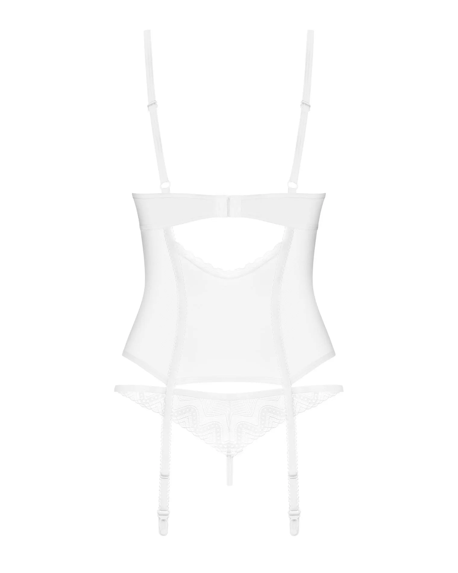 Odkryj uwodzicielski zestaw bielizny, który wpisuje się w ideals wizerunek silnej, pewnej siebie kobiety. Gorset i stringi w eleganckim białym kolorze to kwintesencja udanego połączenia zmysłowości i klasy. Dodatkowe detale, takie jak koronkowe wstawki oraz transparentna tkanina nadają całości niepowtarzalny charakter, który nie pozostawi nikogo obojętnym.